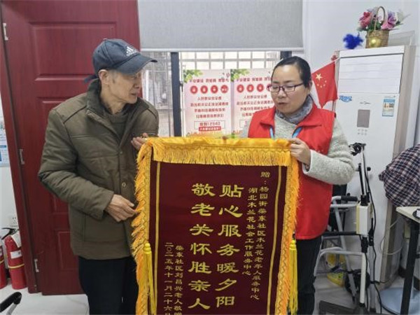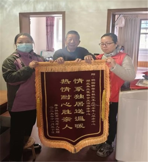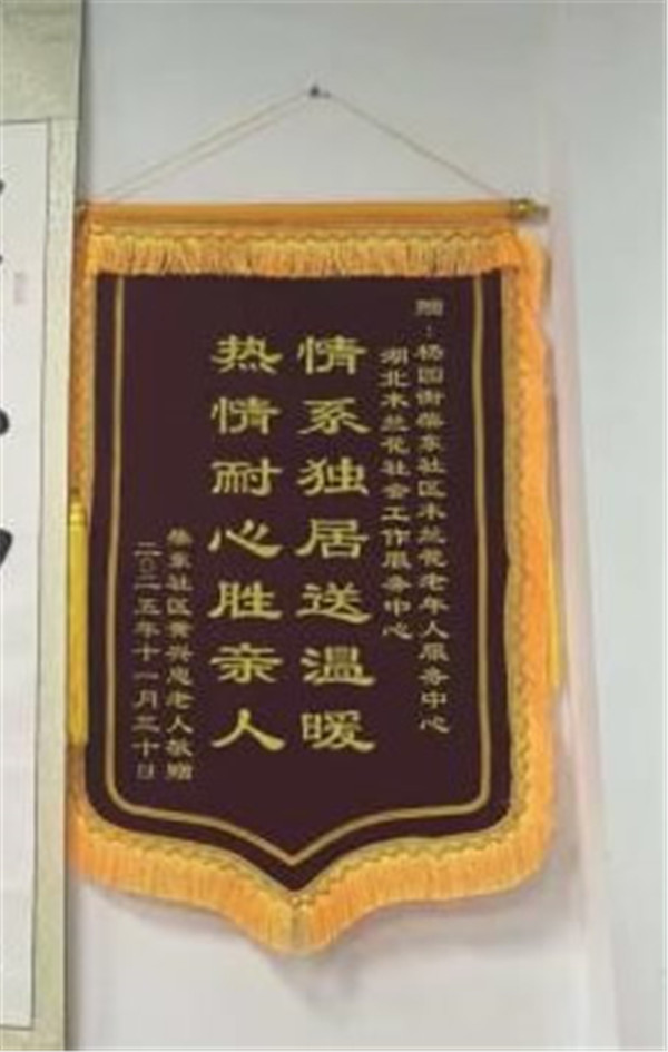 “这面锦旗,是我们全家的心意!”黄兴忠老人送来的锦旗上,“情系独居送温暖,热情耐心胜亲人”十四个字格外醒目。他今年84岁,子女远住的比较远,家里的水管漏水、电灯损坏,都是社区老年人服务中心的工作人员上门帮忙修理;天气变化时,还会特意打电话提醒他添衣保暖。“上次我感冒发烧,工作人员不仅帮我买了药,还熬了粥送过来,说‘您趁热喝,发发汗就好了’,这话听得我心里比粥还暖。”