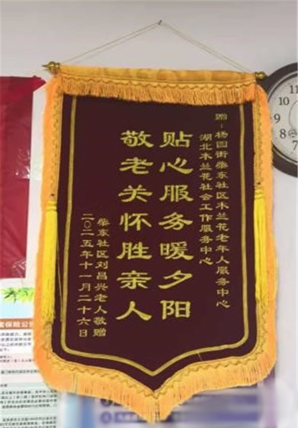 “这面锦旗,是我们全家的心意!”黄兴忠老人送来的锦旗上,“情系独居送温暖,热情耐心胜亲人”十四个字格外醒目。他今年84岁,子女远住的比较远,家里的水管漏水、电灯损坏,都是社区老年人服务中心的工作人员上门帮忙修理;天气变化时,还会特意打电话提醒他添衣保暖。“上次我感冒发烧,工作人员不仅帮我买了药,还熬了粥送过来,说‘您趁热喝,发发汗就好了’,这话听得我心里比粥还暖。”