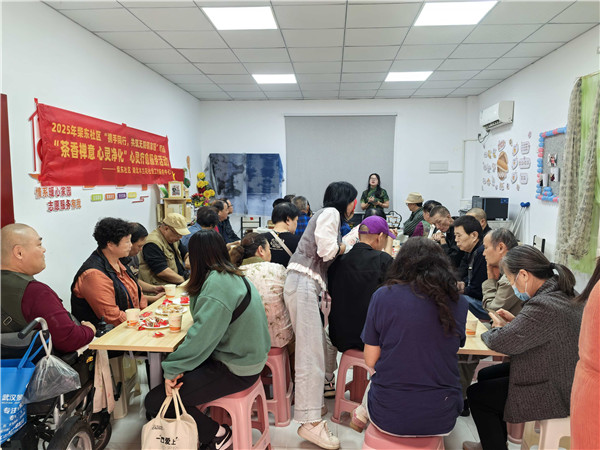 10月14日下午1点,杨园街柴东社区联合湖北木兰花社会工作服务中心,提前2小时启动“携手同行,共筑无障碍家园”项目第二场活动——“茶香禅意 心灵净化”心灵疗愈服务。4名木兰花社工早早到场,挂茶文化纱幔与活动横幅,摆放40人规模的桌椅、乌金石茶台、博古架,细致布置茶道工具、香道物料与茶百戏用具,让会场满溢温馨的传统文化氛围。